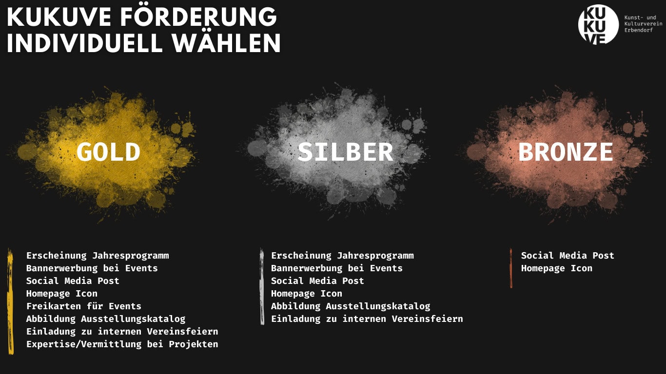 Kunst und Kultur passt zu Ihnen und Ihrem Unternehmen? Dann fördern Sie den KUKUVE und unterstützen Sie uns und unsere Region mit einer Gold-, Silber- oder Bronze-Partnerschaft.
